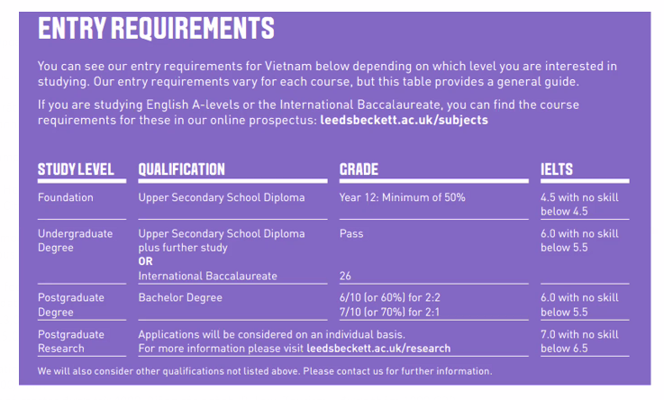 - Tốt nghiệp THPT và hoàn thành 1 năm đại học hoặc hoàn thành khoá Foundation
